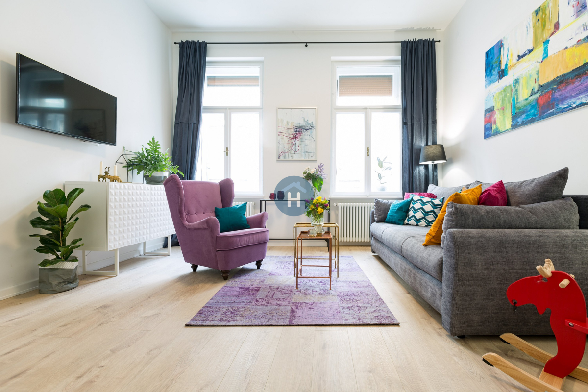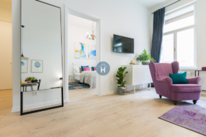 The apartment is on the second floor of a building with no elevator. It consists of one bedroom, one living room, and one bathroom. The bedroom includes a bed and a closet, while a desk and a chair are in the living area. The apartment comes with bed linen and towels. All additional amenities are listed under the facilities section.