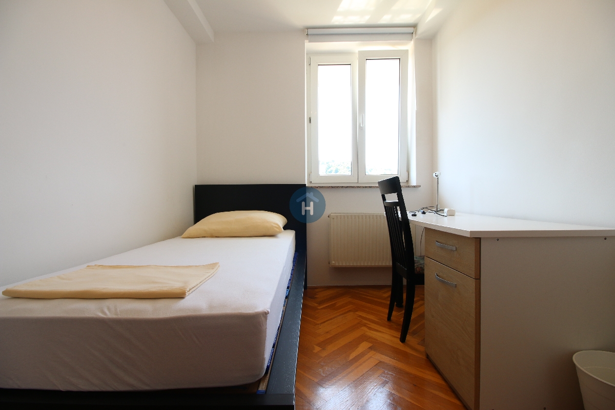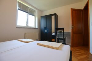 The apartment is on the third floor of a building without an elevator. It consists of three bedrooms, a living room, one bathroom, and a toilet. Each bedroom includes a bed, closet, desk, and chair, and comes with bed linen and towels. All additional amenities are listed under the facilities section.