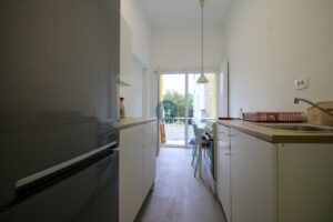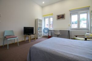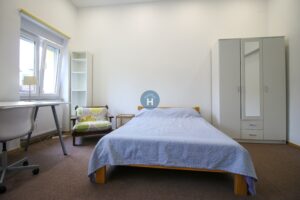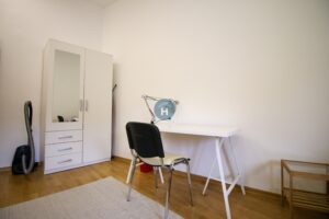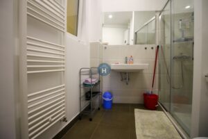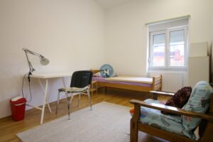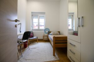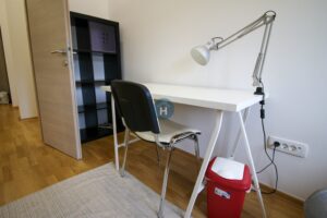 The apartment is on the first floor of a building with no elevator. It consists of three bedrooms and one bathroom. Each bedroom includes a bed, a closet, a desk, and a chair, and comes with bed linen and towels. All additional amenities are listed under the facilities section.