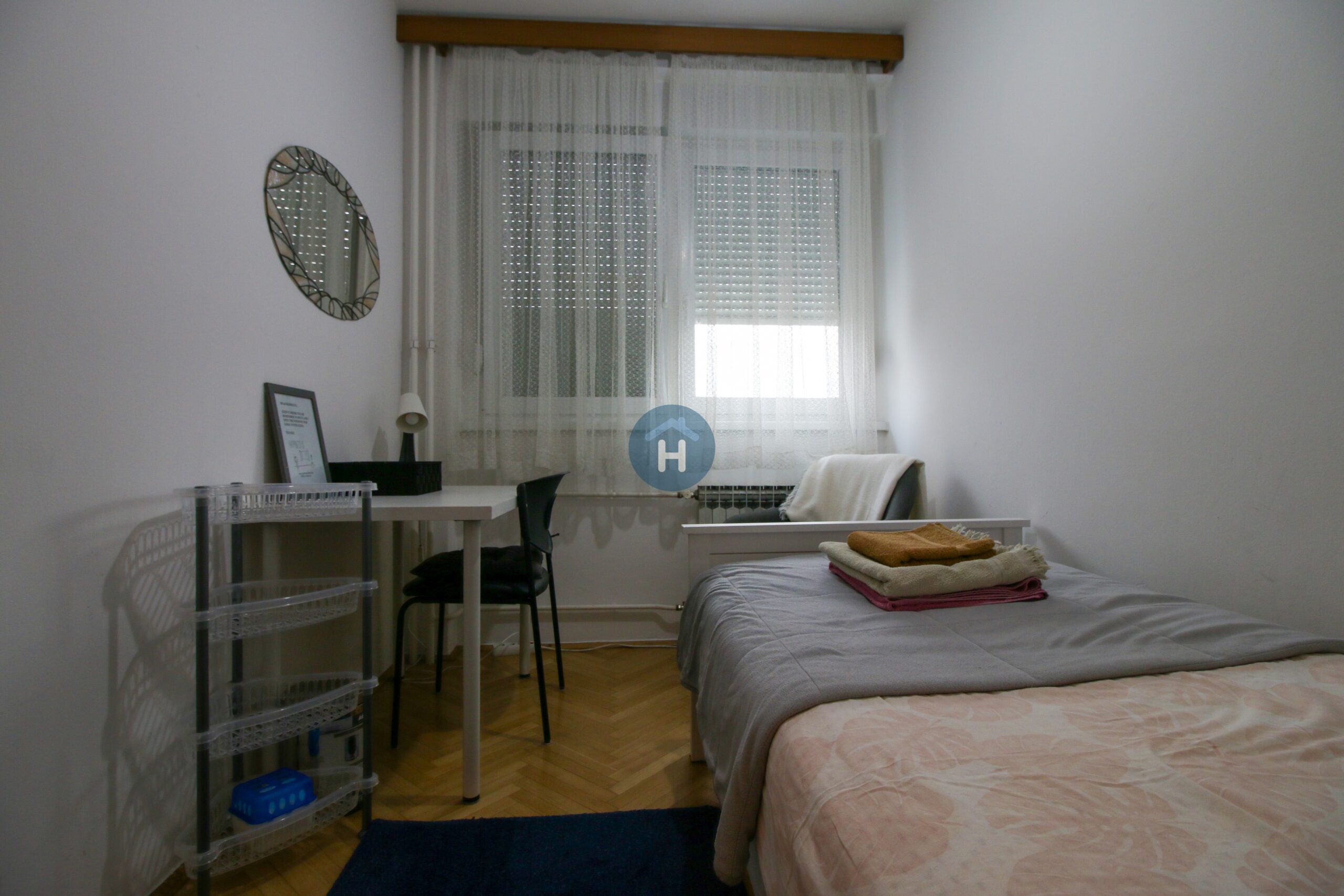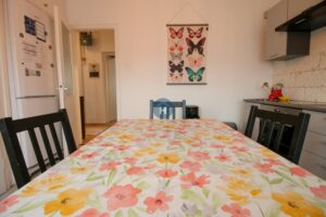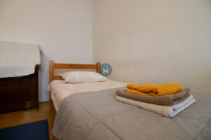 The apartment is on the third floor of a building with no elevator. It consists of three bedrooms and one bathroom. Each bedroom includes a bed, a closet, a desk, and a chair, and comes with bed linen and towels. All additional amenities are listed under the facilities section.