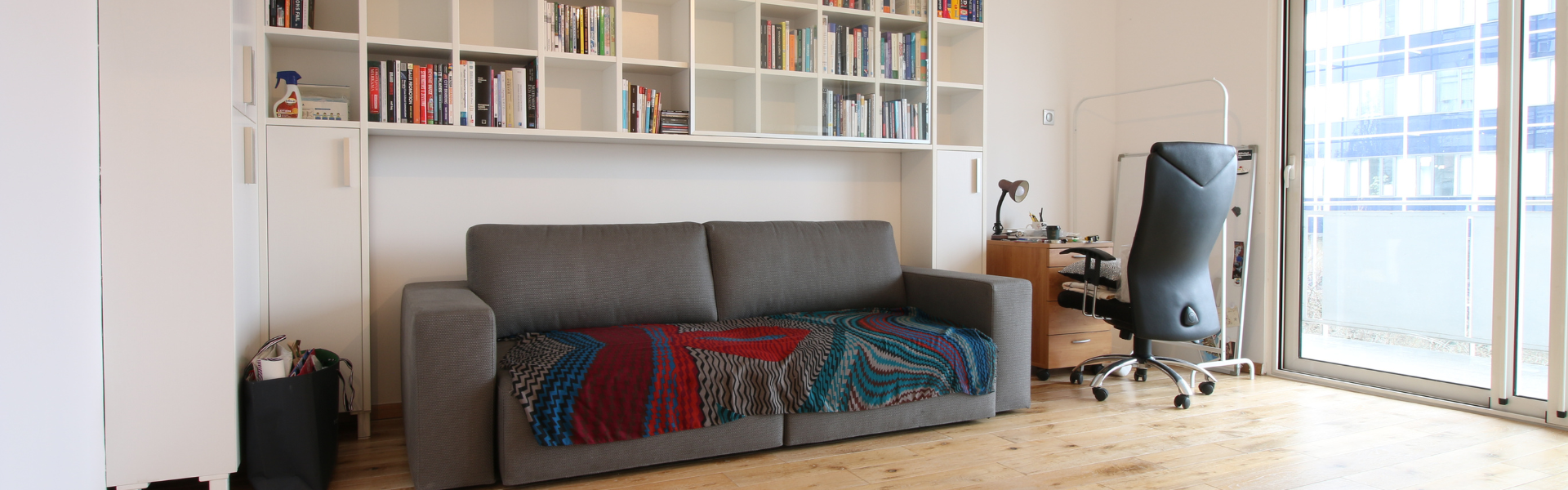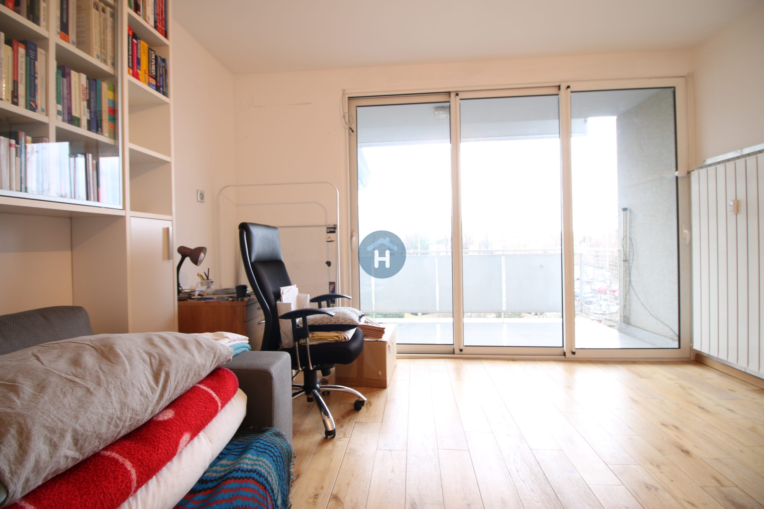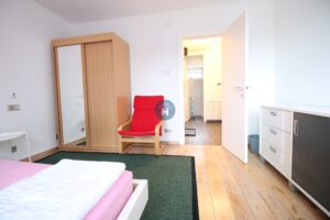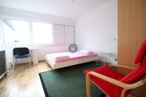 The apartment is on the third floor of a building with an elevator. It consists of one bedroom, one living room, and one bathroom. The bedroom includes a bed, a closet, a desk, and a chair, and comes with bed linen. All additional amenities are listed under the facilities section.