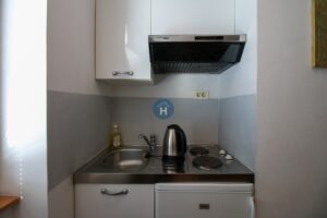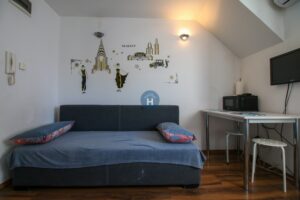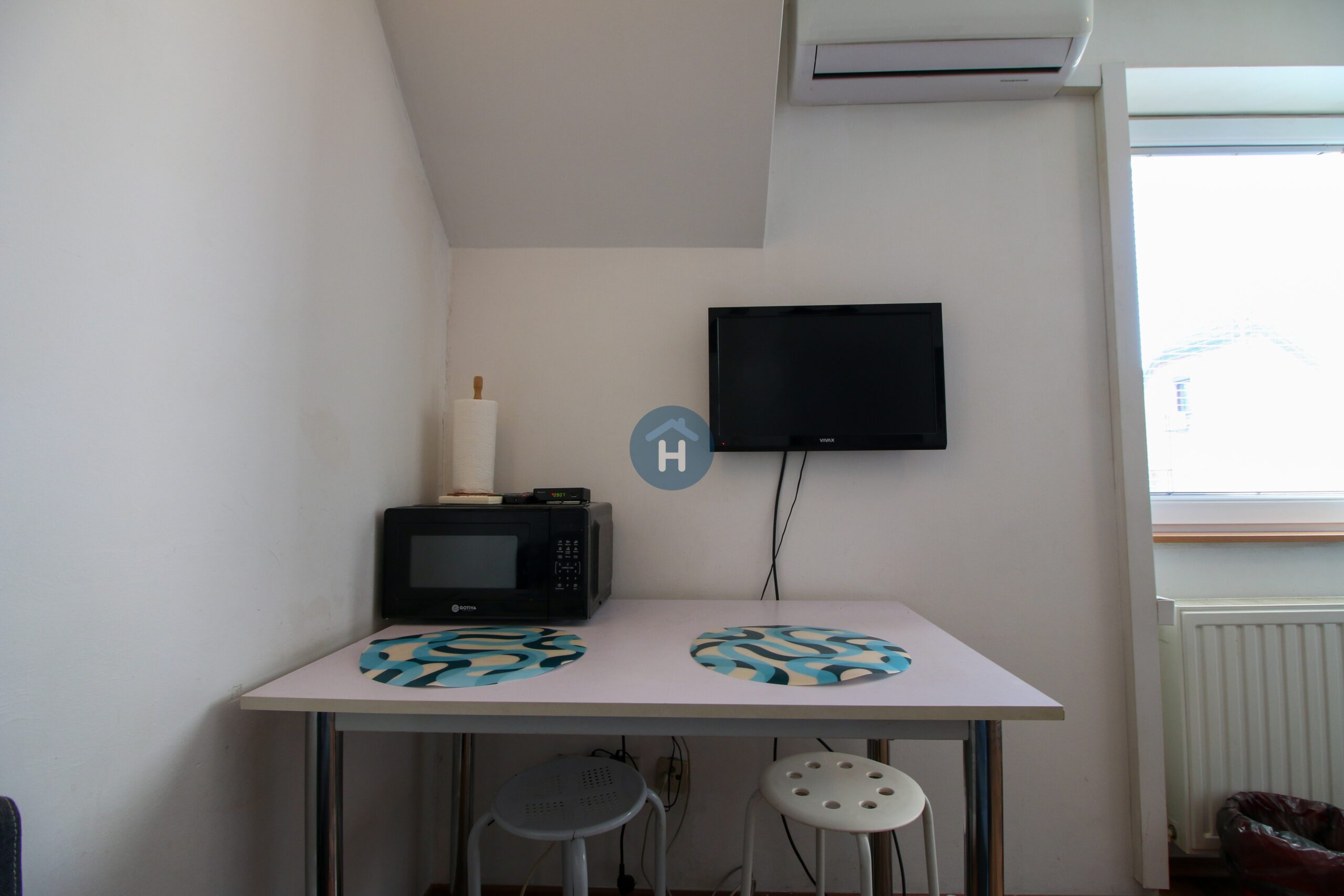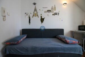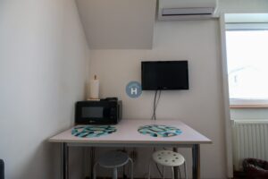 The apartment is on the second floor of a house with no elevator. It consists of one bedroom and one bathroom. The bedroom includes a bed and a closet, while the desk and chair are located in the living room. The apartment comes with bed linen and towels. All additional amenities are listed under the facilities section.