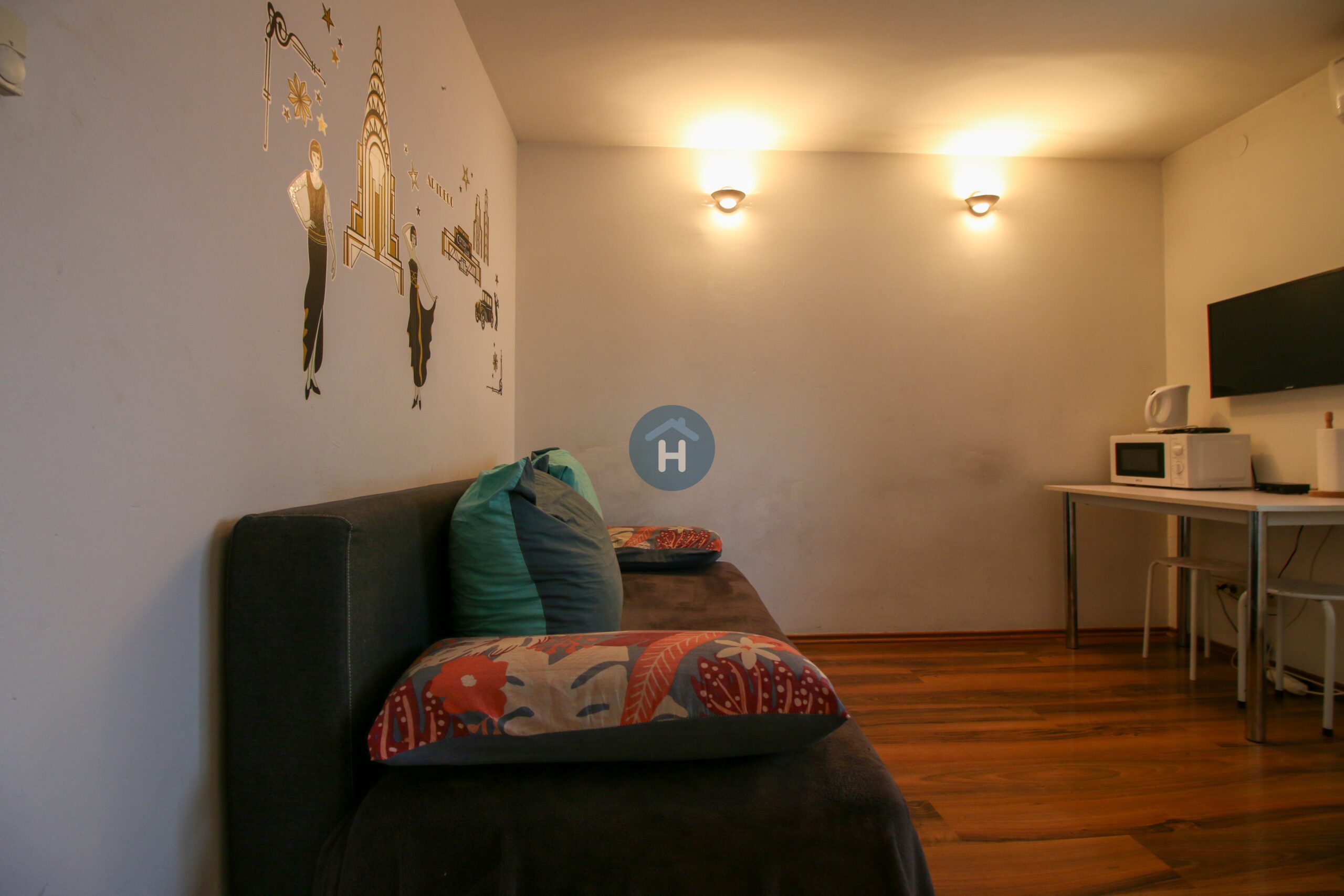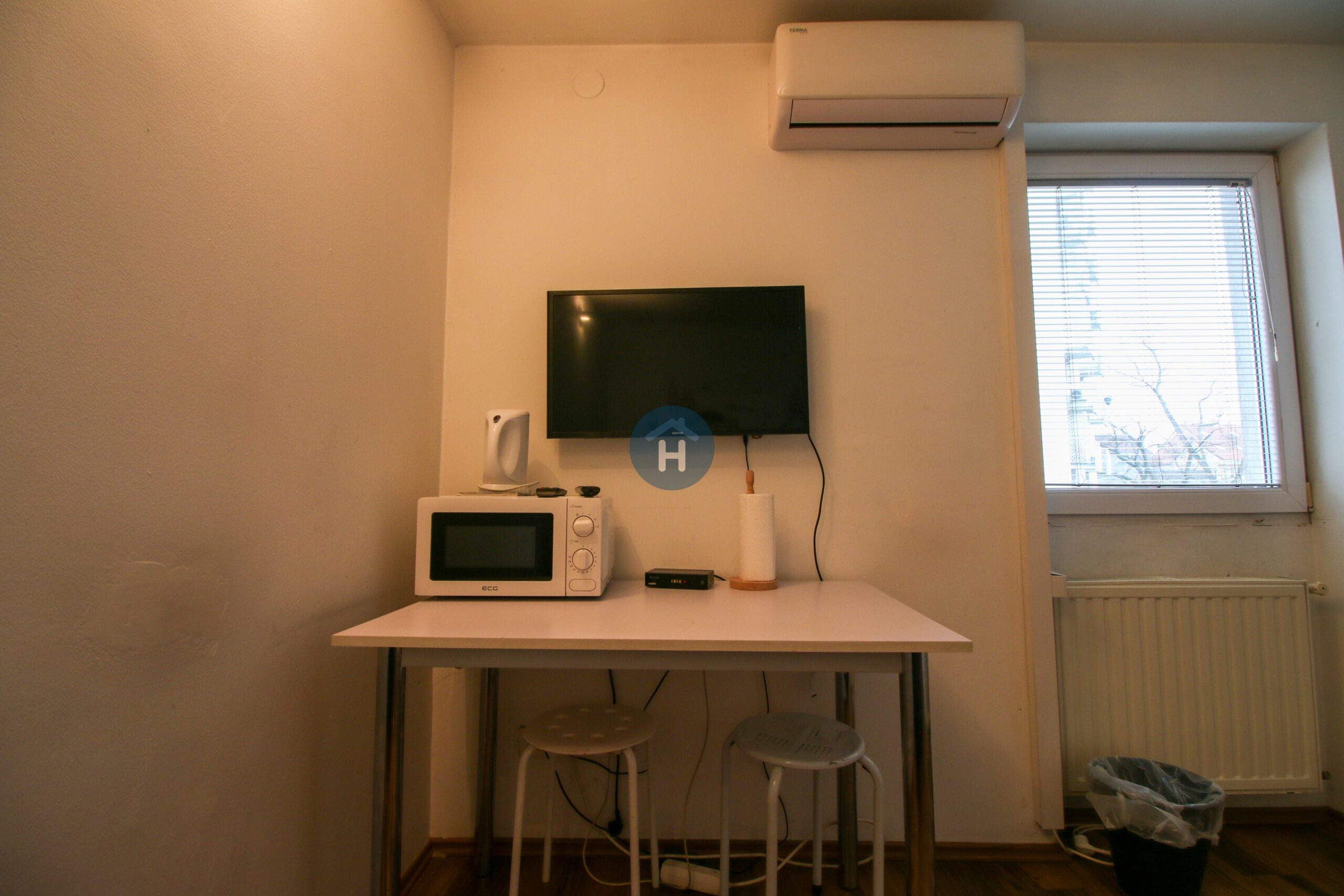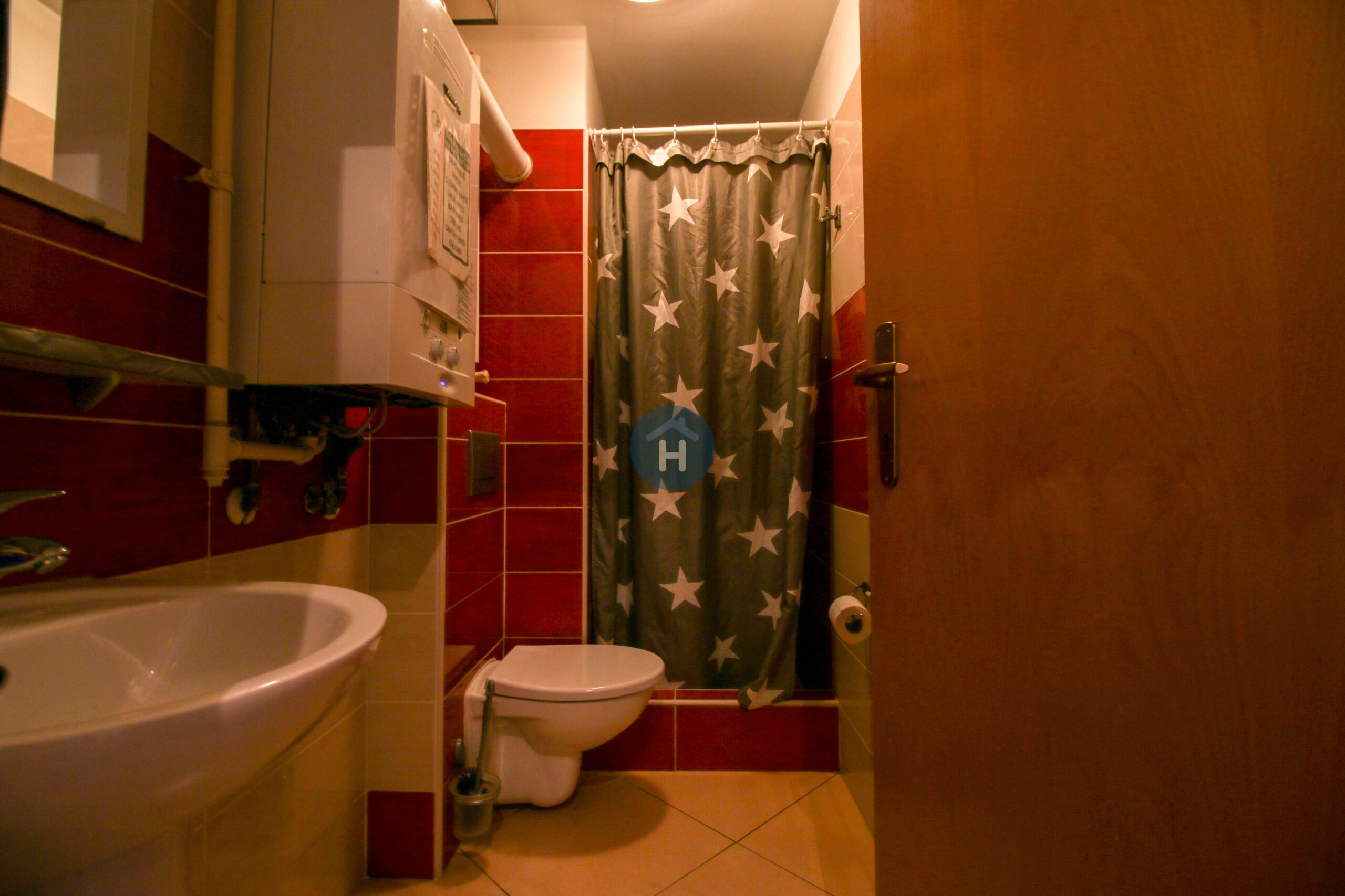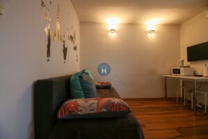 The apartment is on the second floor of a house with no elevator. It consists of one bedroom and one bathroom. The bedroom includes a bed and a closet, while the desk and chair are located in the living room. The apartment comes with bed linen and towels. All additional amenities are listed under the facilities section.
