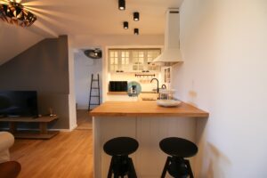The apartment is on the 4th floor of a building without an elevator. It consists of one bedroom, a living room, and a bathroom. The bedroom includes a bed and a closet, and comes with bed linen and towels. All additional amenities are listed under the facilities section.