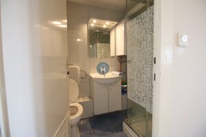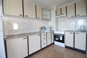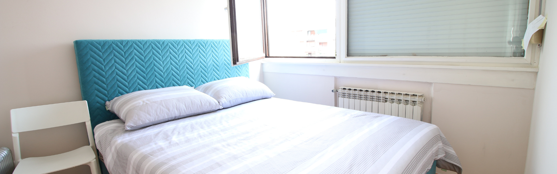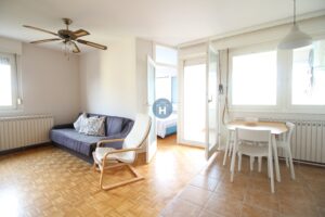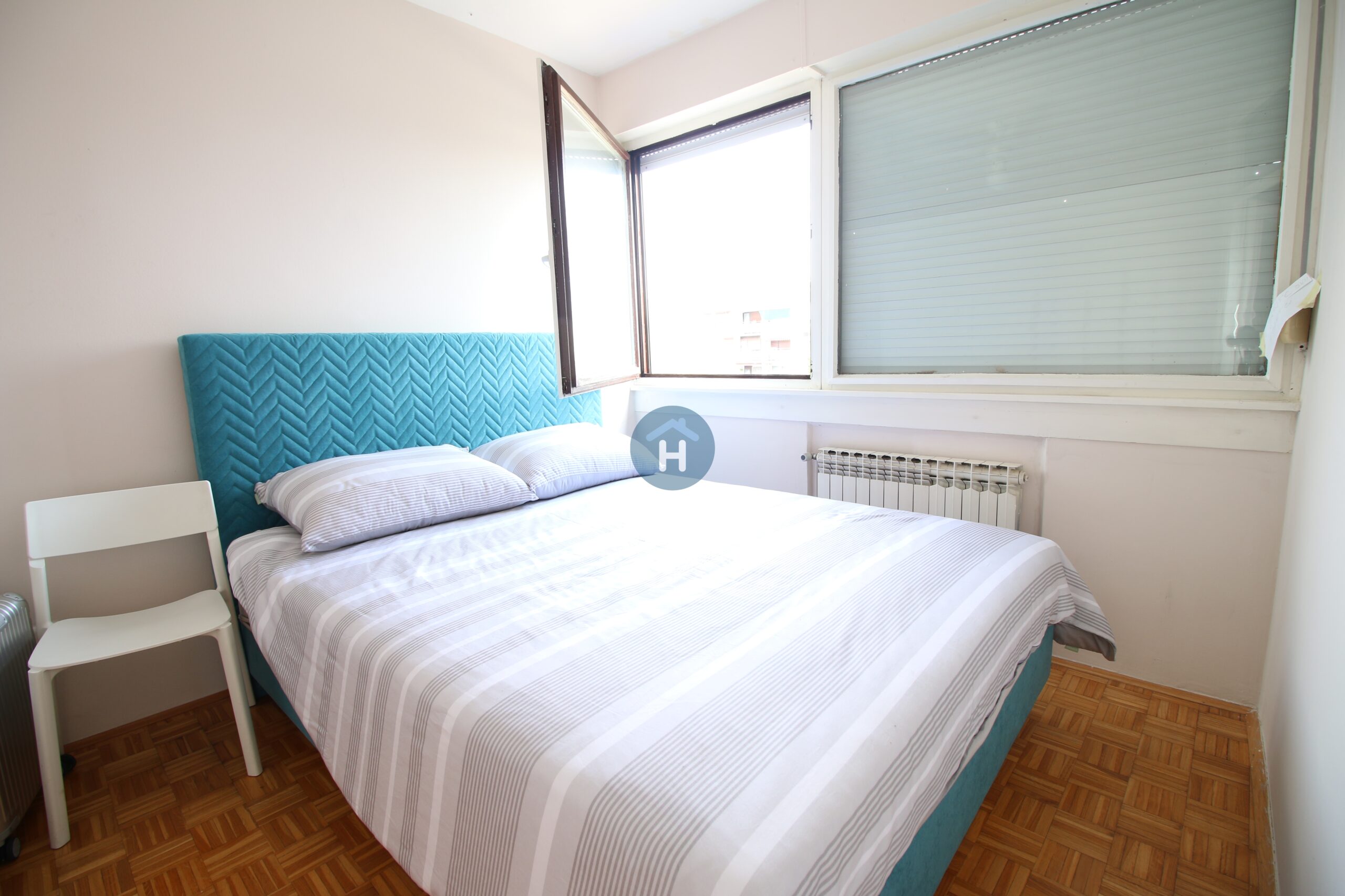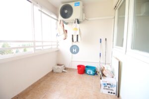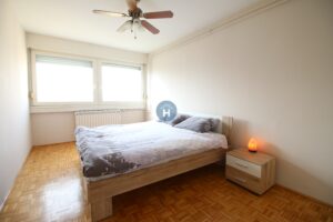 The apartment is on the fifth floor of a building with an elevator. It consists of two bedrooms, one living room, and one bathroom. The bedrooms include a bed, while the closet is located in the hallway, and a desk and a chair are in the living room area. The apartment comes with bed linen and towels. All additional amenities are listed under the facilities section.