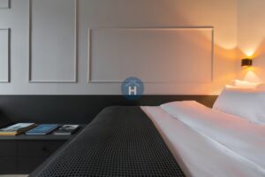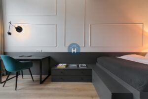 The apartment is on the second floor of a building with no elevator. It consists of two bedrooms, one living room, and one bathroom. One of the bedrooms includes a bed, a closet, a desk, and a chair, while the other bedroom has a bed, and the closet, desk, and chair are located in the living room area. The apartment comes with bed linen and towels. All additional amenities are listed under the facilities section.