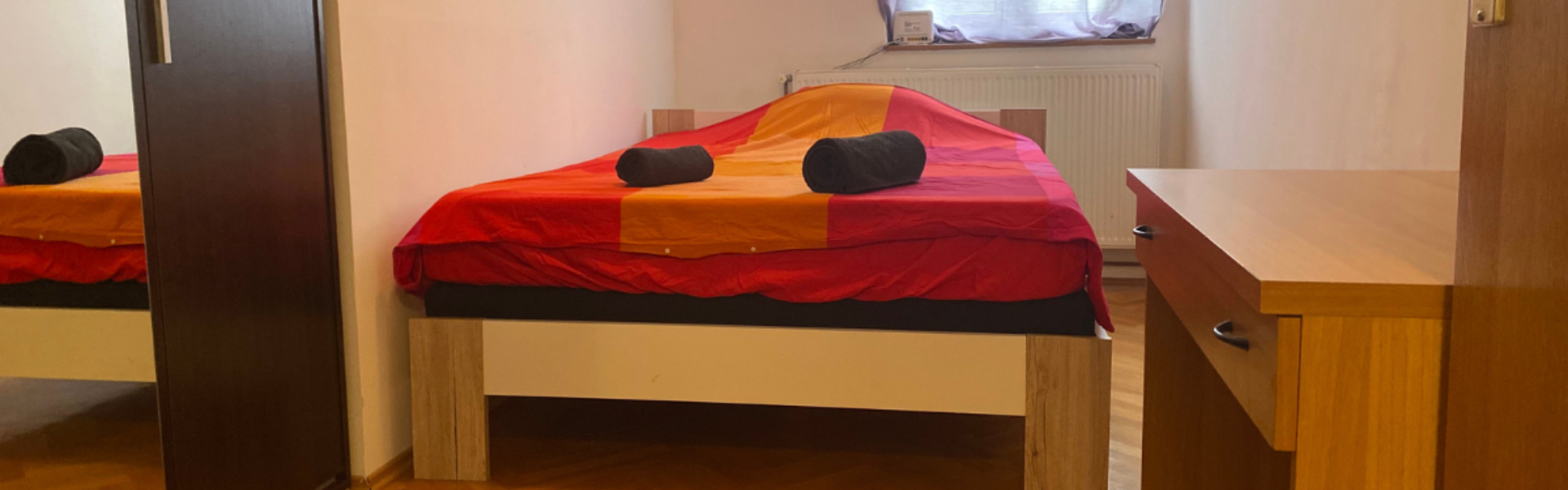 The apartment is on the ground floor of a building with no elevator. It consists of one bedroom, one living room, and one bathroom. The bedroom includes a bed, a closet, a desk, and a chair, and comes with bed linen. All additional amenities are listed under the facilities section.