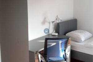 The room is on the first floor of a house with no elevator. The sleeping area includes a bed, closet, desk, and chair, and it comes with bed linen. All additional amenities are listed under the facilities section.