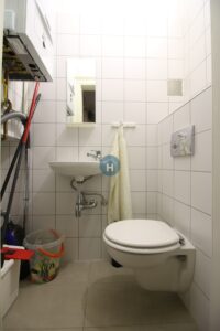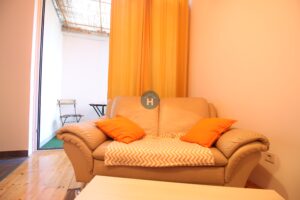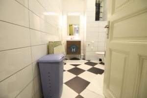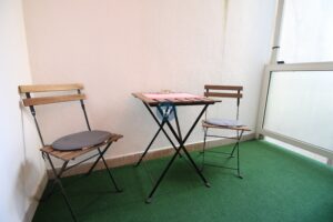 The room is on the first floor of a building with no elevator. It consists of a sleeping area, a shared living room, and a shared bathroom. The sleeping area includes a bed, a closet, a desk, and a chair. The room comes with bed linen and towels. All additional amenities are listed under the facilities section.
