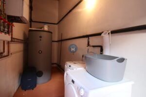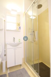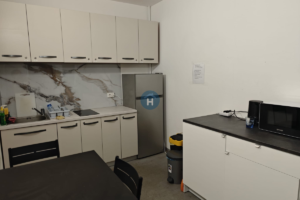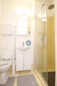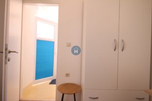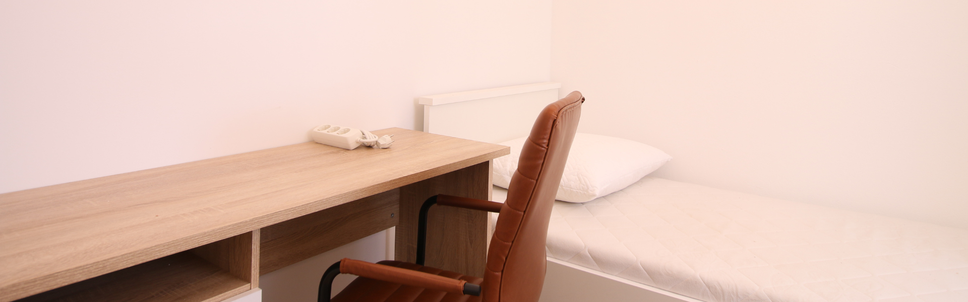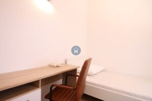 The room is on the ground floor of a house with no elevator. It consists of one bedroom, a shared bathroom, and a shared kitchen and laundry area. The sleeping area includes a bed, a closet, a desk, and a chair. The room comes with bed linen and towels. All additional amenities are listed under the facilities section.