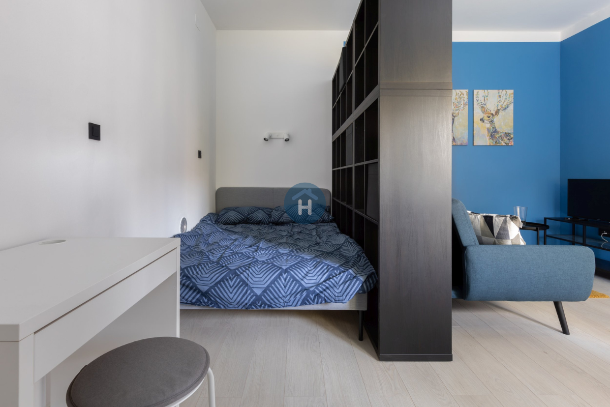 The studio is on the third floor of a building with no elevator. It consists of a sleeping area, one living room, and one bathroom. The sleeping area includes a bed, a closet, a desk, and a chair. The studio comes with bed linen and towels. All additional amenities are listed under the facilities section.
