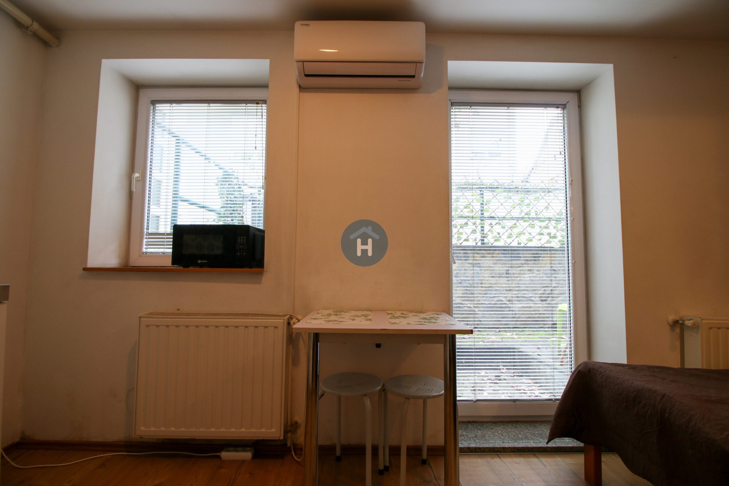 The studio is on the ground floor of a house with no elevator. It consists of one bedroom and one bathroom. The sleeping area includes a bed, a closet, a desk, and a chair, and comes with bed linen and towels.