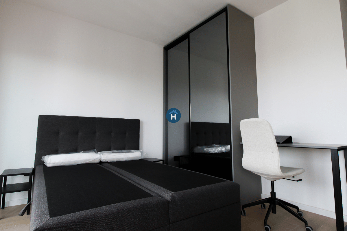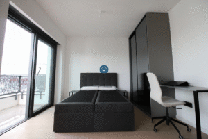 The studio is on the sixth floor of a building with an elevator. It consists of one bedroom and one bathroom. The sleeping area includes a bed, closet, desk, and chair, and it comes with bed linen and towels. All additional amenities are listed under the facilities section.