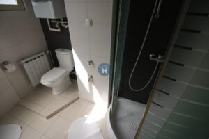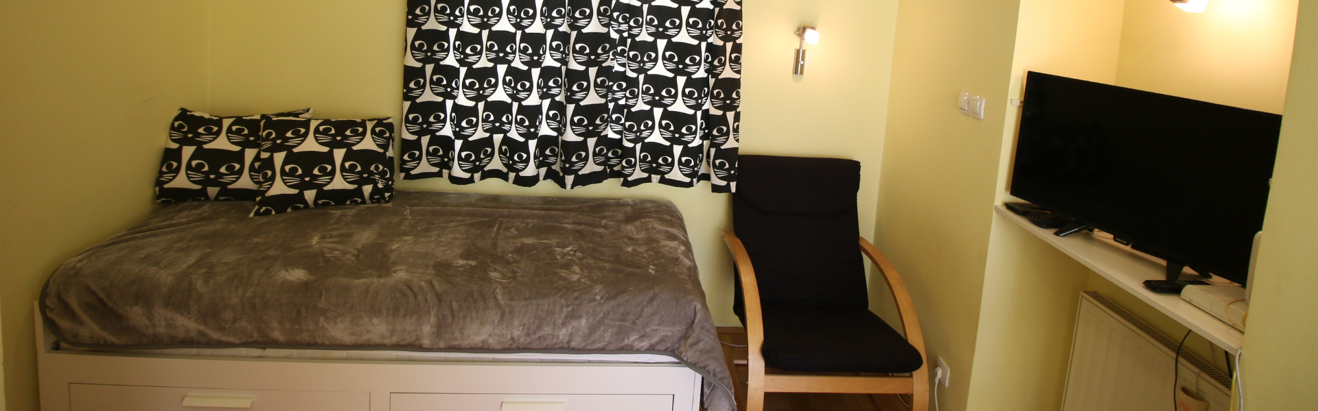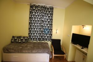 The studio is on the first floor of a building with no elevator. It consists of a sleeping area and one bathroom. The sleeping area includes a bed, a desk, and a chair, while the closet is located in the hallway. The studio comes with bed linen and towels. All additional amenities are listed under the facilities section.