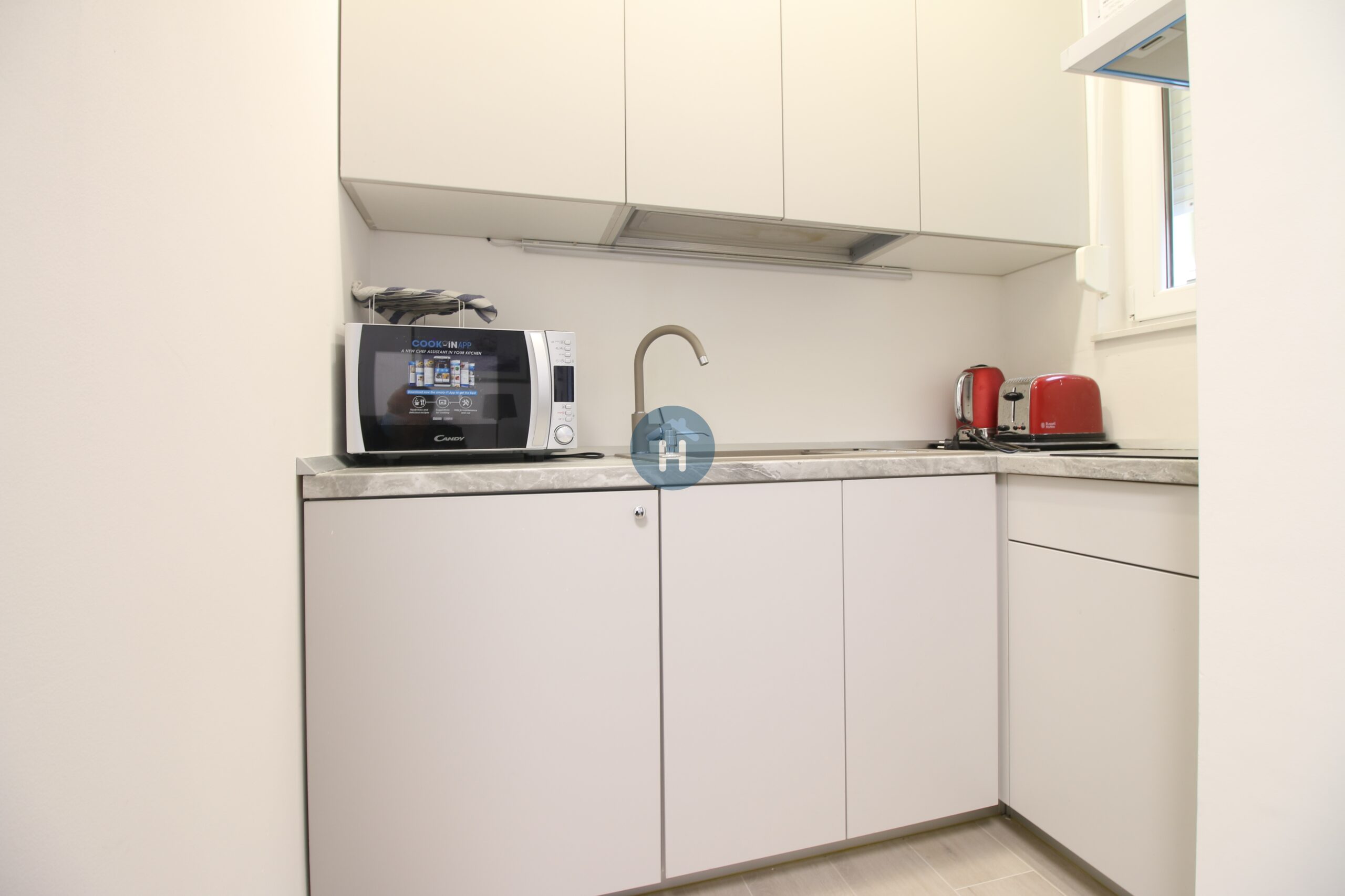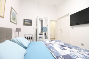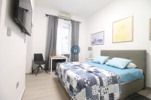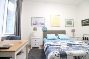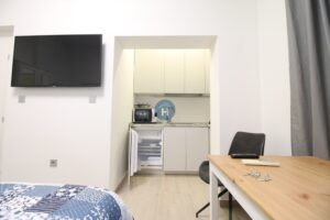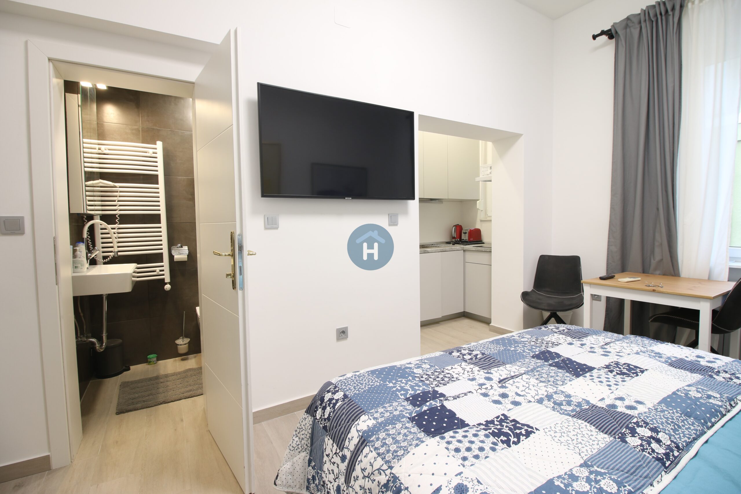 The studio is on the second floor of a building with no elevator. It consists of a sleeping area and one bathroom. The sleeping area includes a bed, a closet, a desk, and a chair. The studio comes with bed linen and towels. All additional amenities are listed under the facilities section.